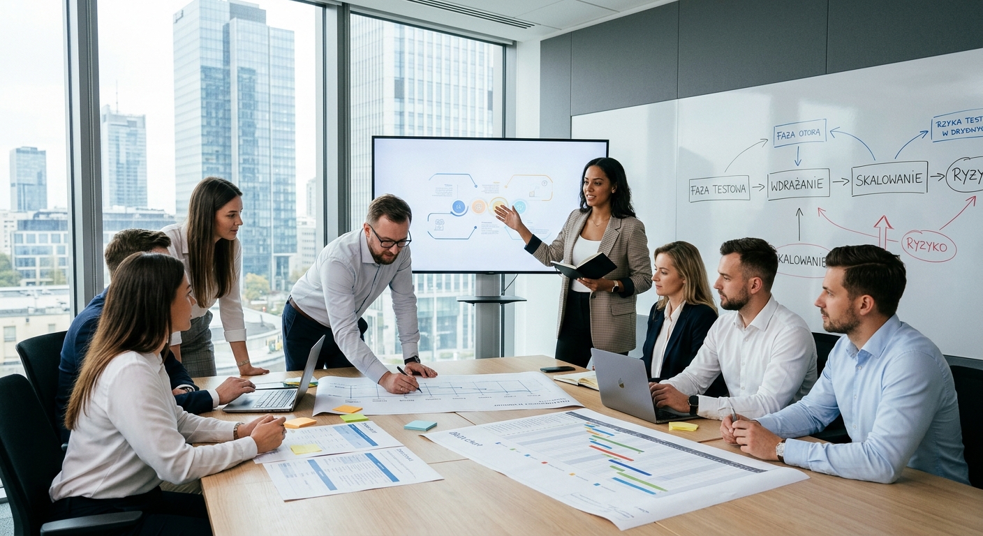 Na tym etapie nie chodzi o liczbę pomysłów, ale o jakość selekcji. Dobrą praktyką jest stworzenie backlogu 20–30 inicjatyw i ocena każdej z nich według dwóch osi: wpływ biznesowy i trudność wdrożenia. Projekty z wysokim wpływem i niską złożonością powinny wejść do pierwszej fali. Reszta trafia do kolejki.